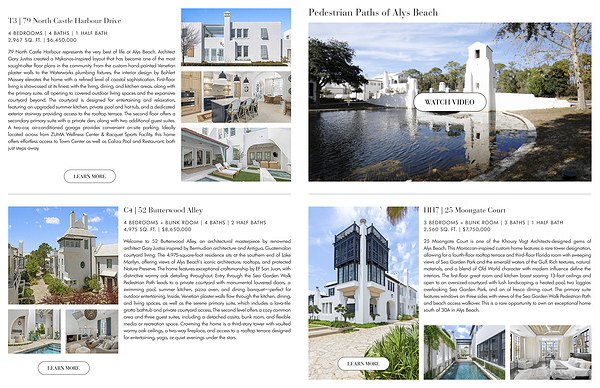 79 North Castle Harbour represents the very best of life at Alys Beach. Architect Gary Justiss created a Mykonos-inspired layout that has become one of the most sought-after floor plans in the community. From the custom hand-painted Venetian plaster walls to the Waterworks plumbing fixtures, the interior design by Bohlert Massey elevates the home with a refined level of coastal sophistication. First-floor living is showcased at its finest, with the living, dining, and kitchen areas, along with the primary suite, all opening to covered outdoor living spaces and the expansive courtyard beyond. The courtyard is designed for entertaining and relaxation, featuring an upgraded summer kitchen, private pool and hot tub, and a dedicated exterior stairway providing access to the rooftop terrace. The second floor offers a secondary primary suite with a private den, along with two additional guest suites. A two-car, air-conditioned garage provides convenient on-site parking. Ideally located across from ZUMA Wellness Center & Racquet Sports Facility, this home offers effortless access to Town Center as well as Caliza Pool and Restaurant, both just steps away.
